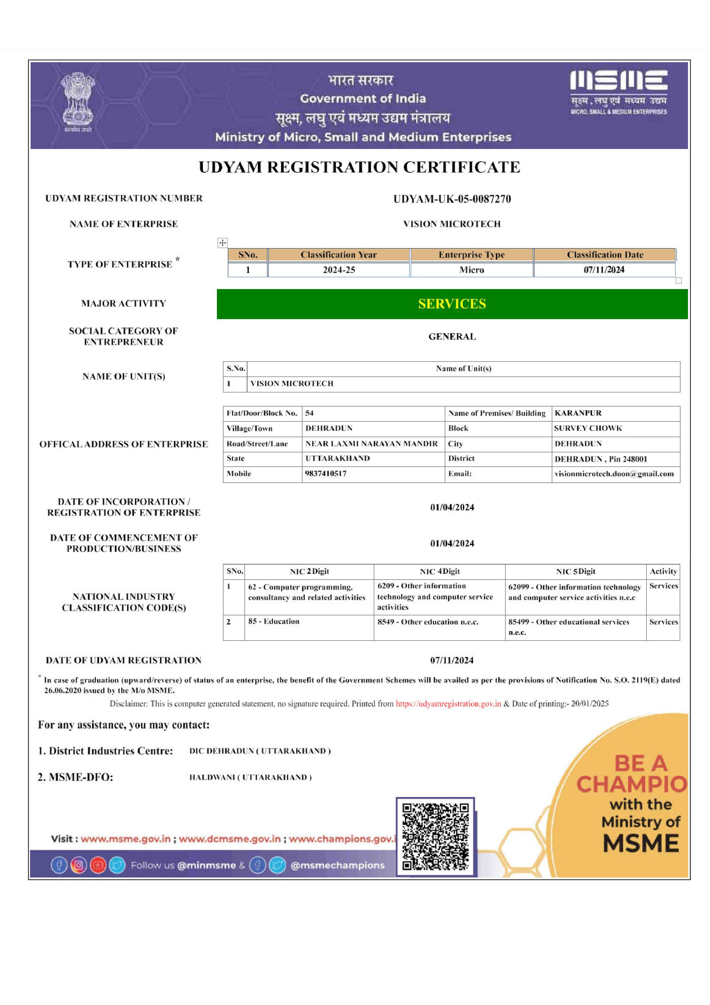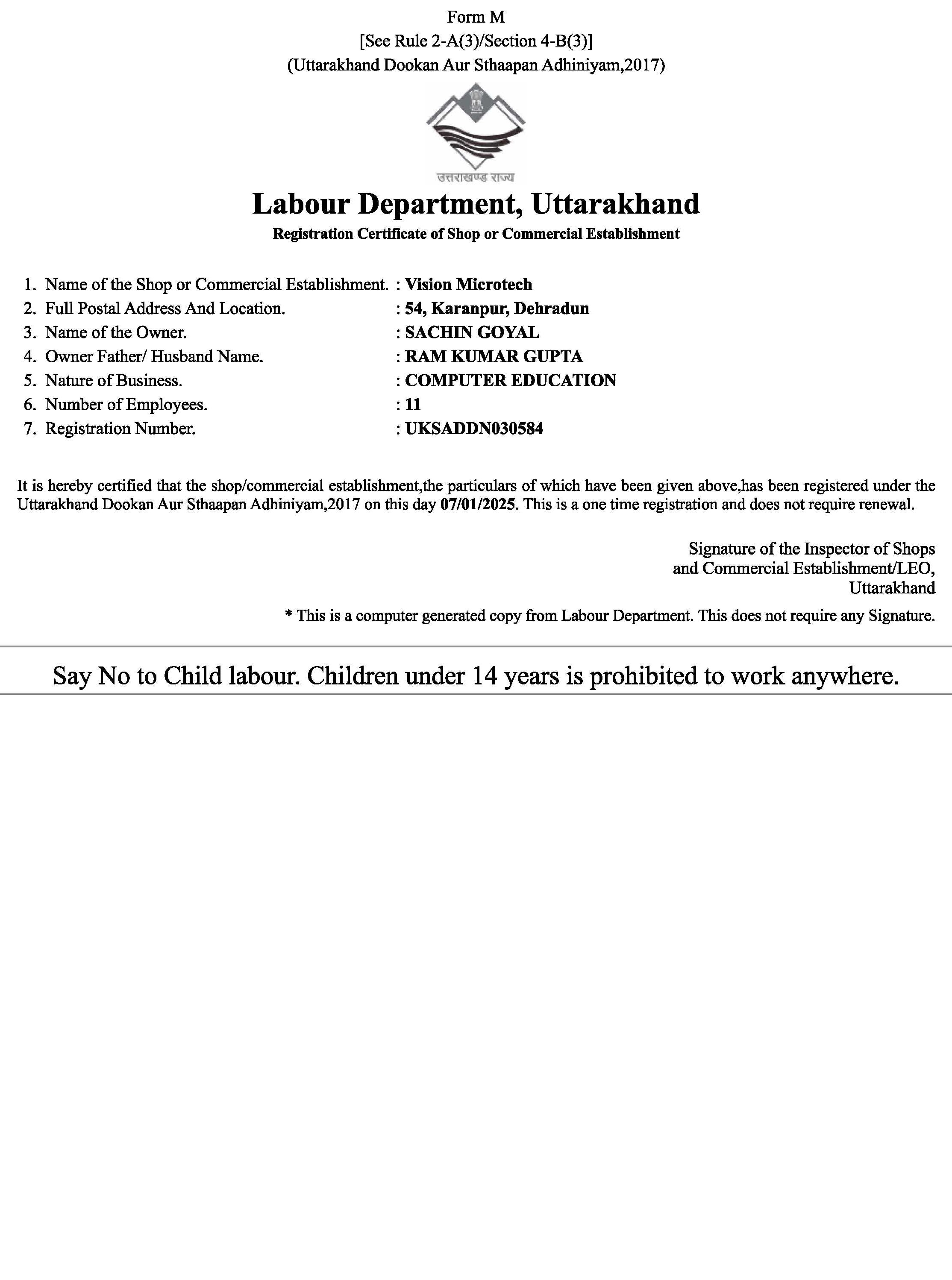 LABOUR DEPARTMENT UTTARAKHAND REGISTRATION CERTIFICATE VISION MICROTECH